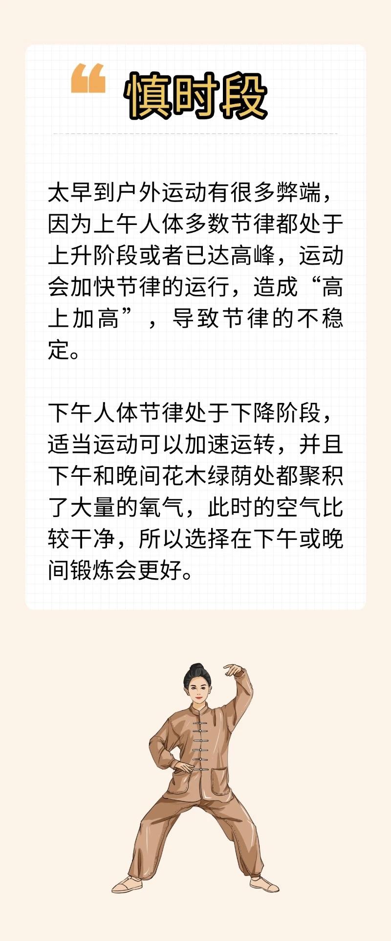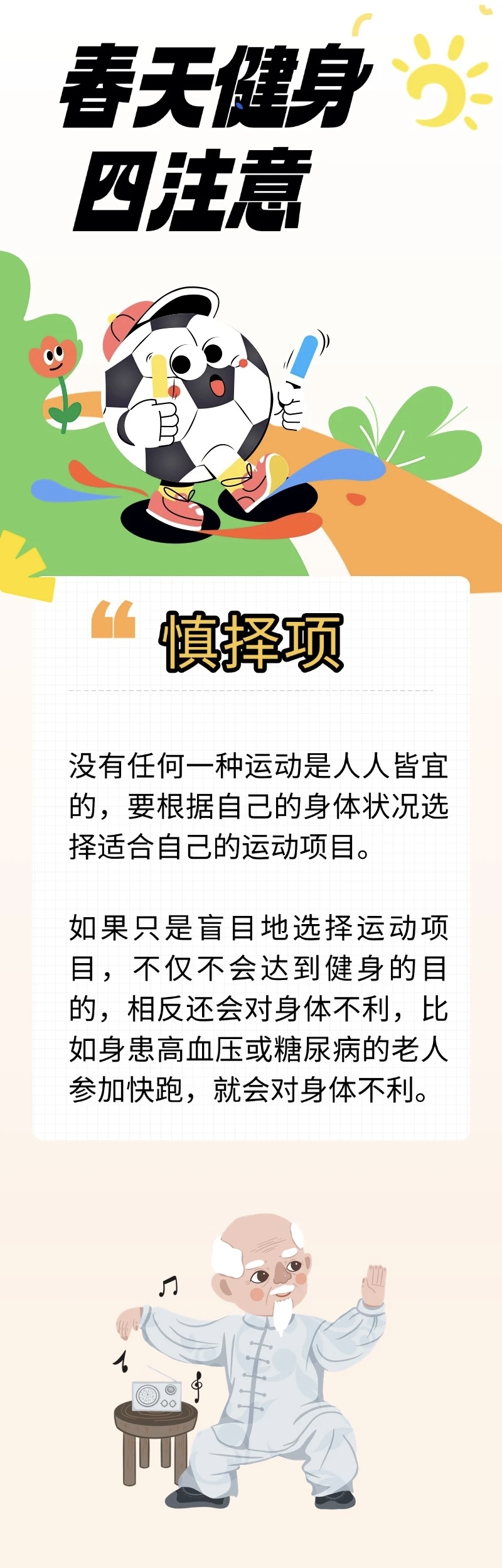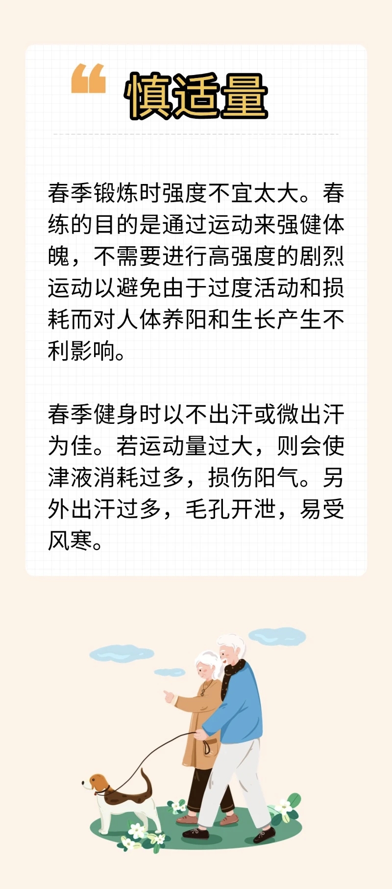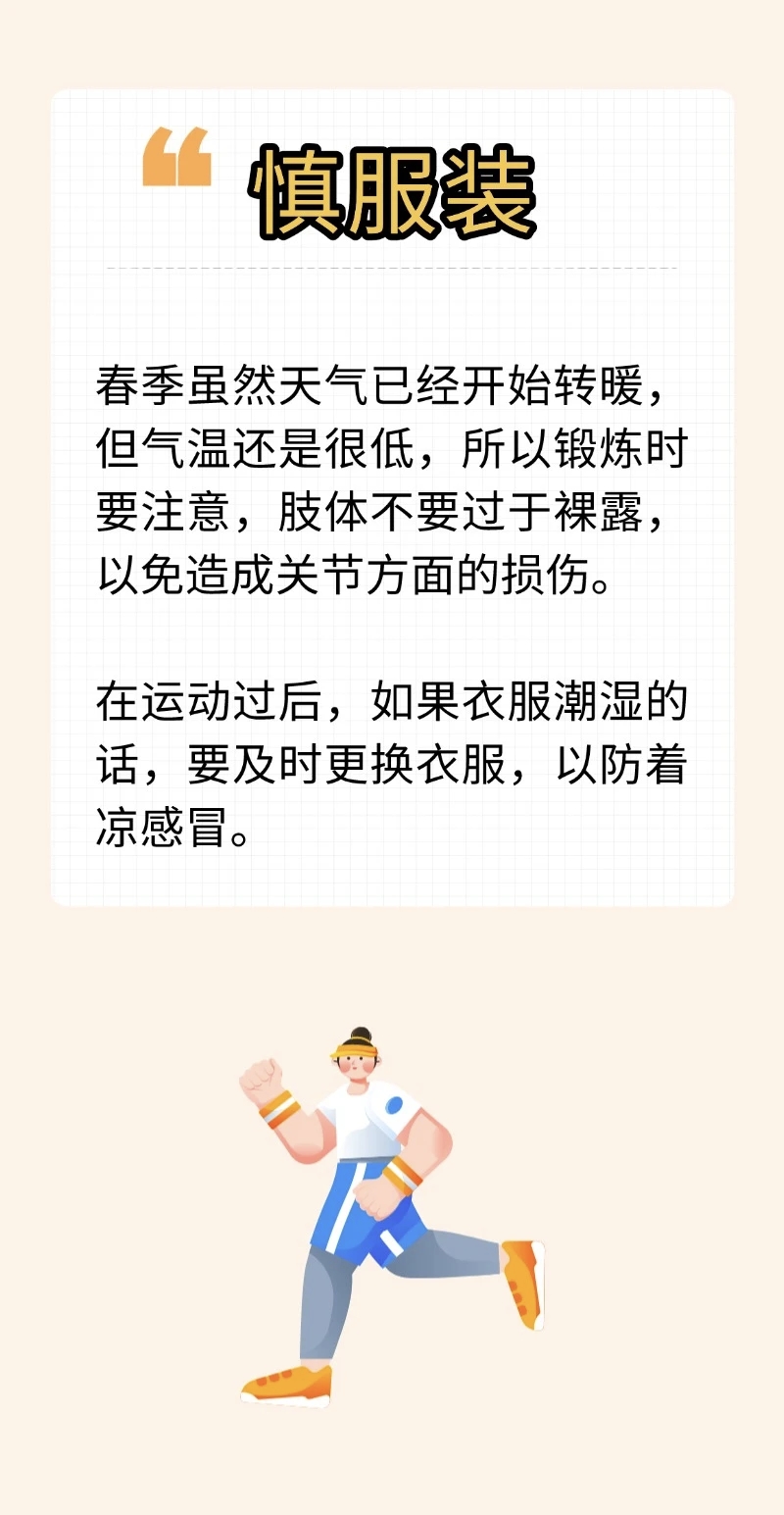春季,天气转暖,人体内的阳气经过一冬的闭藏,会随着春阳生发之势而动,这时应该多参加一些户外锻炼。春季虽然是健身好时节,但在运动健身时要注意四个方面。